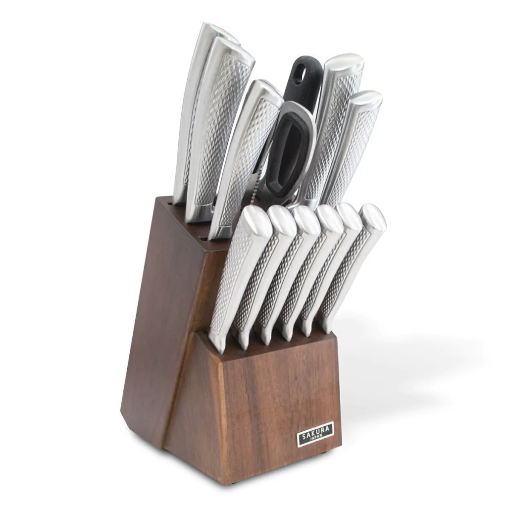 Deja que la colección Sakura® de 14 piezas inspire al chef que hay en tu interior, con cubiertos premium forjados a partir de una sola pieza de acero inoxidable duradero. Las cuchillas de precisión se estrechan a un borde fino y ultra afilado garantizando un rendimiento claramente superior a cualquier cuchilla estándar, por lo que cada tarea de corte se puede completar con facilidad y precisión inmejorable. Elegantes mangos diseñados ergonómicamente brindan un agarre seguro, lo que permite que cada cuchillo sea fácil de controlar y da a lugar, tanto a principiantes en la cocina como hasta el chef más experimentado, a crear obras maestras.